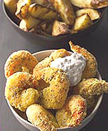 Dip prawns in beaten egg, then roll in polenta mixture. Place on a non-stick baking sheet and bake in oven with potato wedges for a further 10 minutes.
